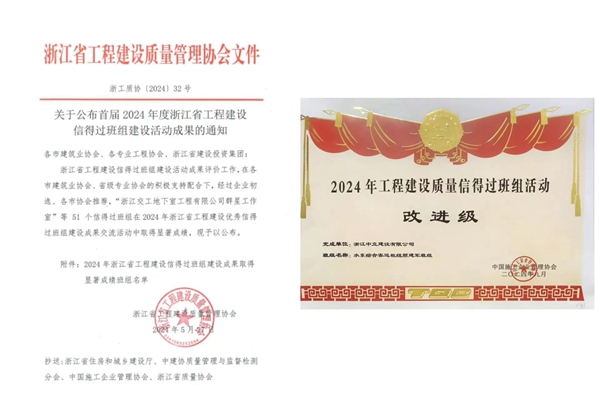 在2024年度工程建設(shè)質(zhì)量信得過班組比賽中,我公司水東樞紐項目團(tuán)隊獲得浙江省建設(shè)成果取得顯著成績班組和中國施工企業(yè)管理協(xié)會《2024年度工程建設(shè)質(zhì)量信得過班組改進(jìn)級》。