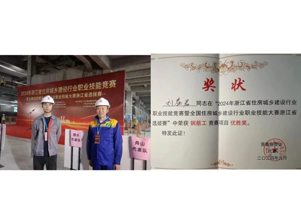公司員工劉益君參加2024年浙江省住房城鄉(xiāng)建設(shè)行業(yè)職業(yè)技能競賽暨全國住房城鄉(xiāng)建設(shè)行業(yè)職業(yè)技能大賽中,榮獲“鋼筋工競賽項目優(yōu)勝獎”。