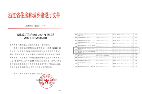 在2024年浙江省省級工法評選中,“富水軟土地質(zhì)條件下灌注樁高效接樁施工工法”與“基于BIM技術(shù)復(fù)雜大曲面GRC安裝施工工法”2項工法榮獲浙江省省級工法。