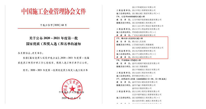 12月1日,中國(guó)施工企業(yè)管理協(xié)會(huì)公布了2020~2021年度第一批國(guó)家優(yōu)質(zhì)工程獎(jiǎng)入選工程名單,中立建設(shè)承建的縉云縣人民醫(yī)院遷建工程榜上有名。這是公司獲得的第一個(gè)國(guó)家優(yōu)質(zhì)工程獎(jiǎng)項(xiàng)目,也是麗水市本地企業(yè)第一個(gè)獲國(guó)家優(yōu)質(zhì)工程獎(jiǎng)項(xiàng)目。
